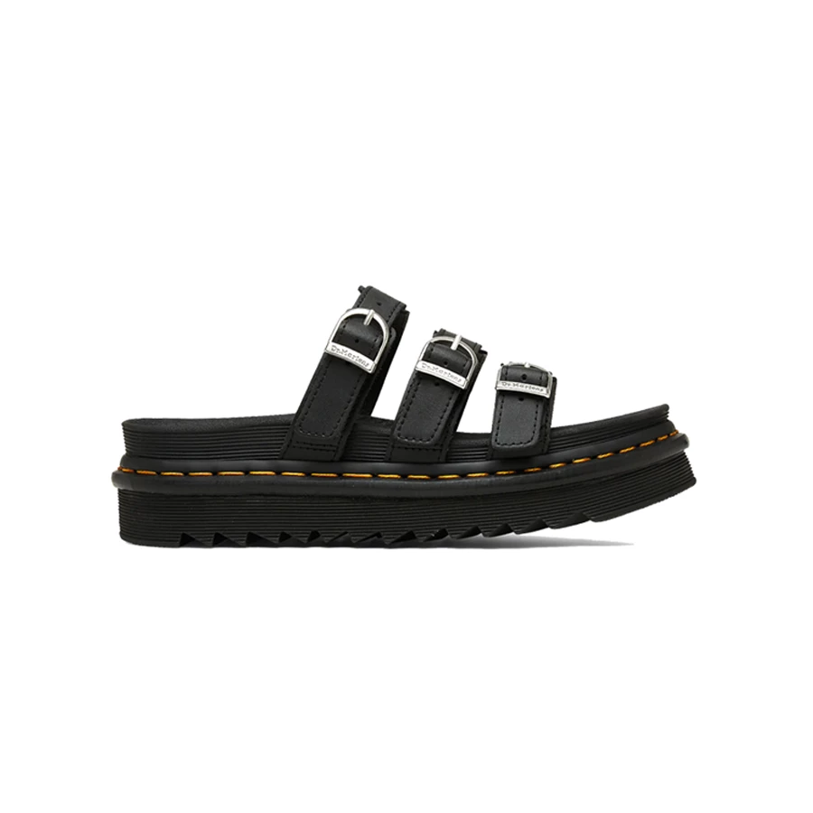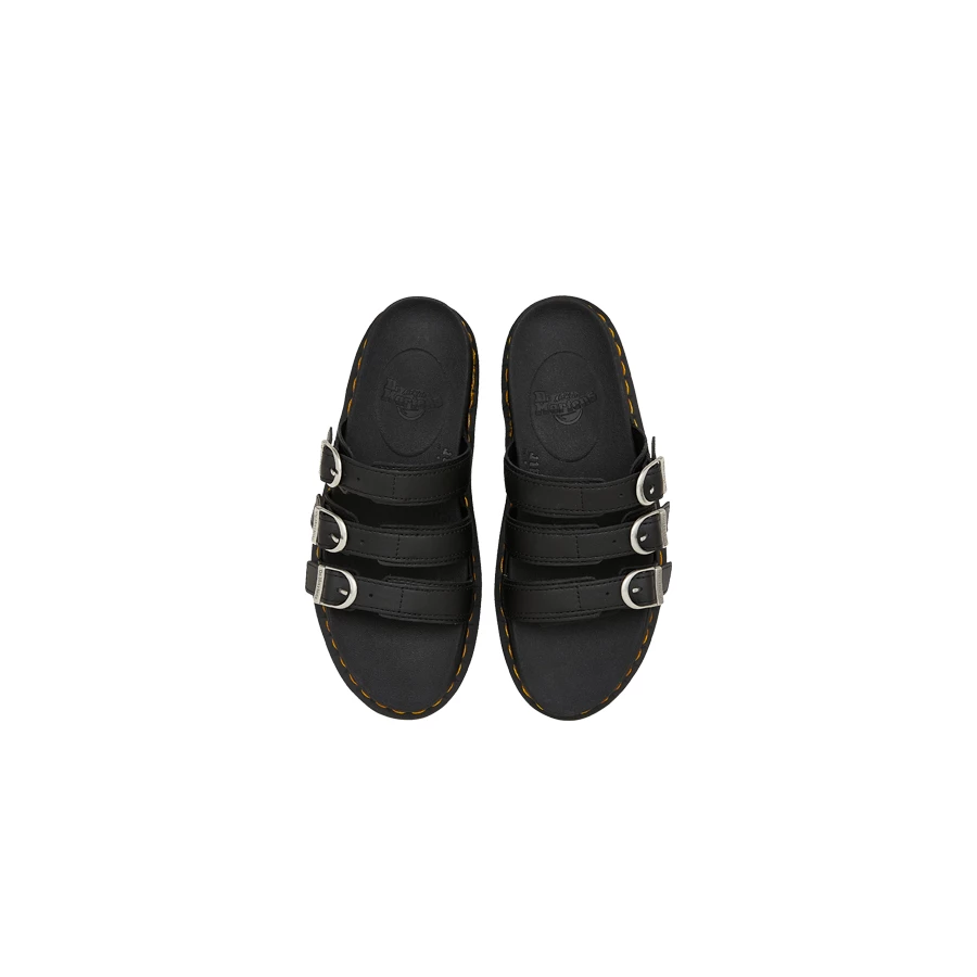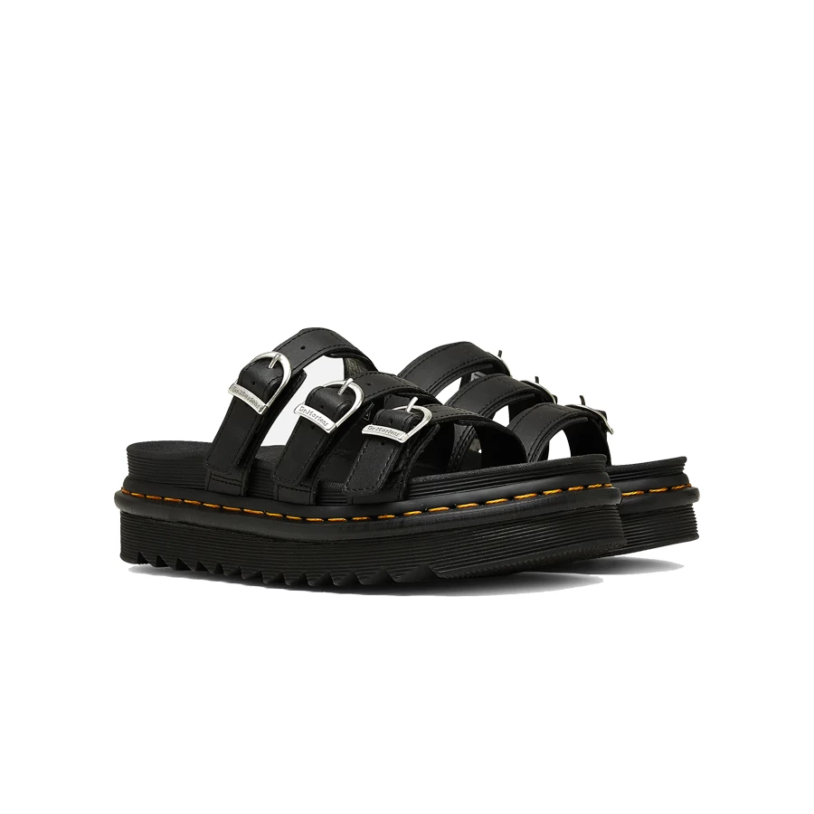 Sandalo a ciabatta da donna di Dr Martens, parte della collezione Zebrilus, realizzati in pelle Hydro: liscia, rivestita in PU e con finitura opaca. Il prodotto presenta tre cinturini regolabili, una leggera suola Ziggy in EVA, cuciture gialle ed un platform da 4cm. Calzata leggermente più ampia rispetto agli stivali Dr Martens; se ti trovi tra due taglie, ti consigliamo di acquistare quella più piccola.