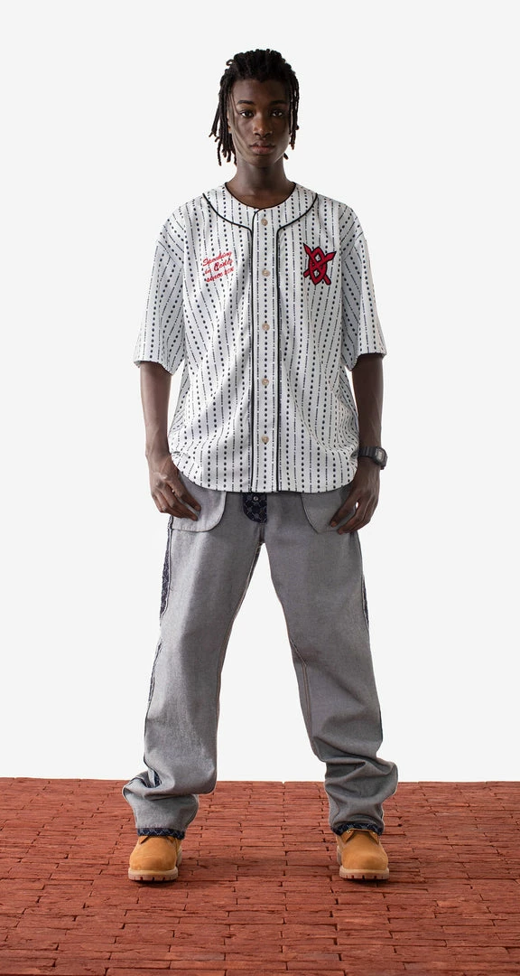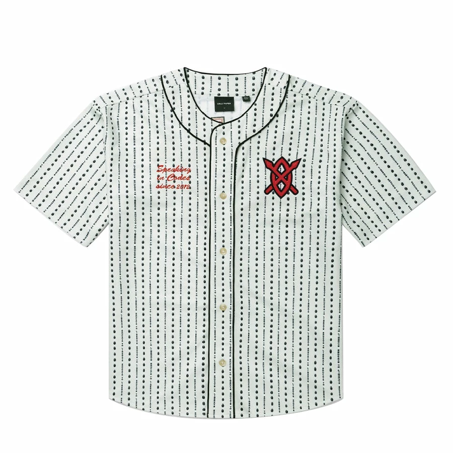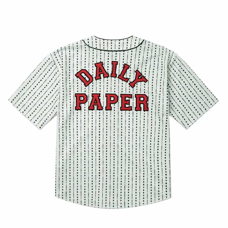 Questa shirt oversize con spalle scese ha l’aspetto e il fit di una maglia da baseball con una finitura contemporanea. Tagliato da una rete fortemente strutturata, il tessuto spesso ha un motivo gessato unico che recita “Educate to Liberate”. Un classico colletto a camicia da baseball, abbottonatura e piping a contrasto completano questo stile retrò. Impreziosito da ricamo a punto catenella e scudo, oltre a patch artistica Daily Paper con bordi ricamati sul retro.